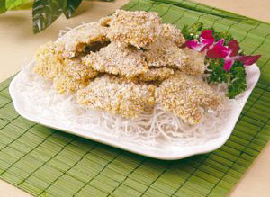 2、净鸭用盐、味精、酒搓匀内外,入大盘。在鸭上放葱段、姜丝、砂仁、豆蔻、丁香,入笼蒸烂,去调料,剔去骨,再切成大块,挂上鸡蛋糊。在鸭皮面粘上芝麻,在鸭肉面粘上面包糠,入六成熟油锅炸黄捞出,改刀成菱形块装盘即成。