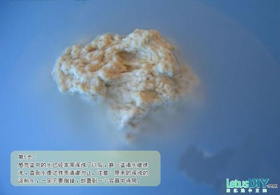 第五步:感觉盆中的水已经非常浑浊了以后,换一盆清水继续洗,直到水和图上这样变的清澈为止。注意:原来的浑浊淀粉水不可以倒掉,放到一个容器中待用。