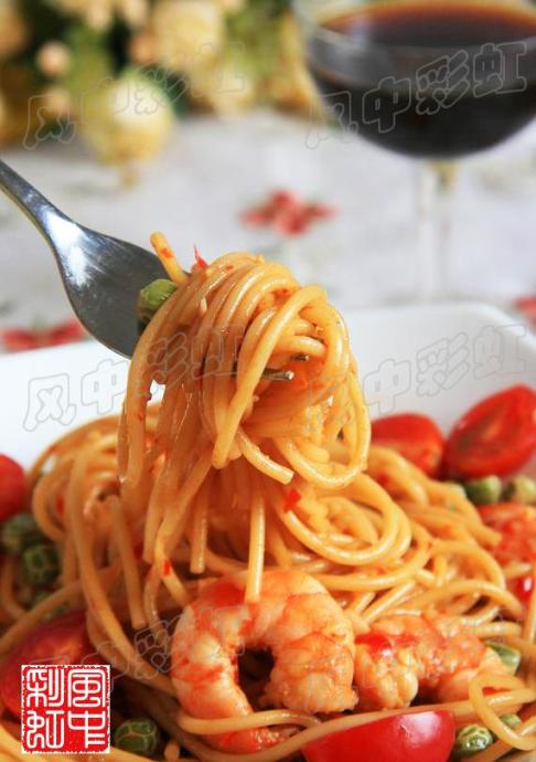 意大利面100克、虾4只、泡椒5个、葱1段、姜2片、大蒜4瓣、豌豆30克、鱼香汁1碗、小西红柿数个。