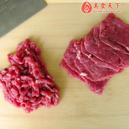2、牛肉先逆丝切成薄片(逆丝可以使牛肉丝口感更嫩),再将薄片切成丝;