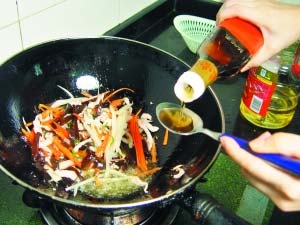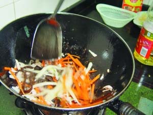 5 、加入1/2汤匙料酒、1/5汤匙白胡椒粉、1/4汤匙盐和1/3汤匙鸡粉炒匀入味。