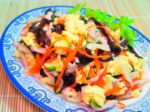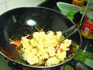 6、 倒入炒蛋,与锅内食材一同拌炒均匀,即可上碟。