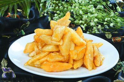 油炸薯条 将红薯洗净、去皮,放入清水中浸泡2分钟,接着切成小薯条,再倒入沸水锅内烫1分钟,沥干后在油锅内炸1分钟左右,待薯条炸透,捞起沥干油,即可食用。