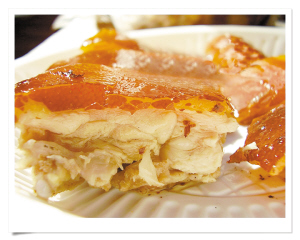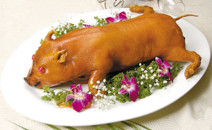 烧乳猪早已成为佛山市民的喜好。一个大盘上放着一只金黄色的小烧猪,香味四溢,闻着就想吃。
