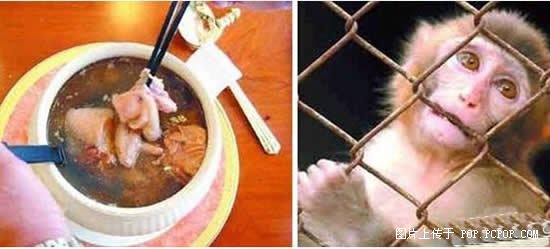 猴头:这里说的猴头绝不是食用菌猴头,而是真正的猴脑。一个中间挖洞的方桌,几个人围桌而坐,中间的洞并不象火锅或是麻辣烫那么大,正好容一只猴子的 头伸出。一只非常可爱的猴子牵出,据说那是专门食用的猴儿,头比较大。猴儿的头顶从小洞中伸出,用金属箍住,并且箍的非常紧,用小锤轻轻一敲,头盖骨应声 而落。猴的脑部就完全裸露在食客们的面前。这时,有较馋一些的人,已经用汤匙升向红白相间的猴脑,随着桌下垂死猴子一声惨叫,拉开了生食猴脑惨状的序曲。