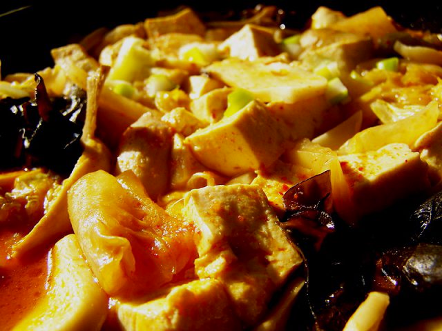韩式泡菜锅这个韩式泡菜锅非常健康,主要有泡菜、豆腐、木耳和蘑菇。~~泡菜切块,油热后放入煸炒,加少许番茄酱,出来后汤色会更漂亮。出香味后放入木耳,加水、盐、冰糖、豆腐,小火炖煮几分钟,待豆腐入味,放入蘑菇,开锅后即可。味道很不错哦。