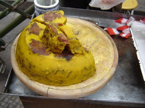 好像叫做柿子糕,黄色的是黄豆做的,红色就是晒干的柿子饼做的吧,不甜,很重的黄豆味