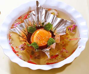 进去之后才发现,里面天然的世界整个就与外界的喧嚣隔绝开来。这是一座古宅大院,拥有浓郁茂密的草地和树木,青色的地砖看起来特别的古朴,还有丝竹在微风中浮动,迎面一阵香气飘来,这里难不成是仙境?服务员领我们来到一座位于角落的玻璃屋里,透着玻璃看着院子里的美景,鸟儿在树上飞舞,柳絮在空中飘荡,隐约间还能闻到青草的气息和花的芳香,这让我想起了“广叶结清荫,繁花连素色”的美好意境。之后我又品尝了“福报”、“烟火非鱼”、“菌香烟雨”、“香绕人间”等精美素食,其名称、外观都极具意境,且口味香醇,据说全部是选用施有机肥的绿色蔬菜和上等的精品素肉制成,烹饪中绝无五辛,不含鸡蛋,既富营养,又无毒素。这次的素食体验,让我感触颇深,原来素食也可以做的这样精致鲜美,并且在我满足了口感的享受以后,还不会增长脂肪,炎炎的夏季让我看到了身材苗条的曙光。