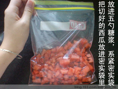 记得把空气挤掉,这样能加快沙冰的形成,还有记得用手把果肉稍微揉搓均匀哦!