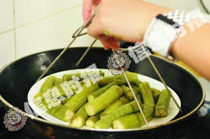 3、烧开锅内的水,放入秋茄,加盖开大火隔水清蒸10分钟左右,取出摊凉。