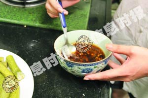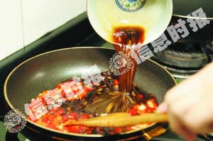 5、烧热2汤匙油,炒香蒜末和红椒丁,淋入酱汁炒匀煮沸,洒入香菜末,便可熄火。