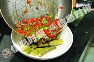 7、将酱汁淋在秋茄上,拌匀即可食用。