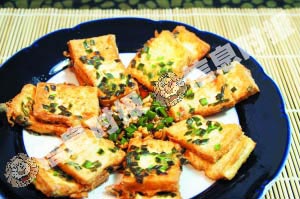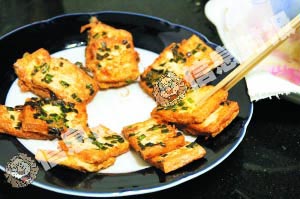 5、尽量让豆腐沾上韭菜末,也可油煎时在豆腐洒少许韭菜,可让煎好的豆腐外观极佳。
