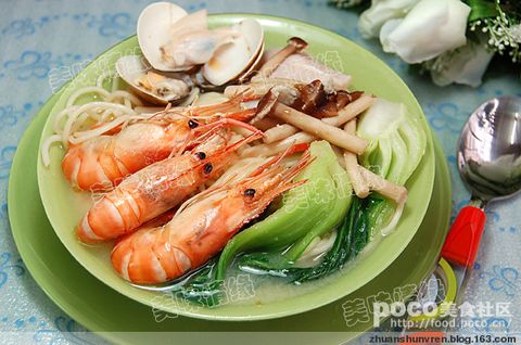 5、把海鲜铺在面上、然后把锅中的上汤淋上面中,就可以开吃啦!