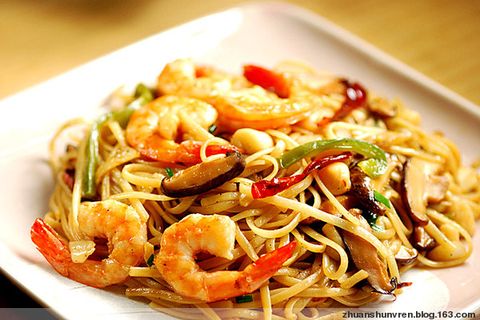 食材:面条、鲜虾、鲜贝、香菇、红辣椒、青椒、葱、