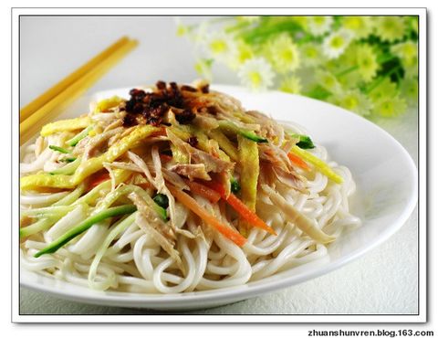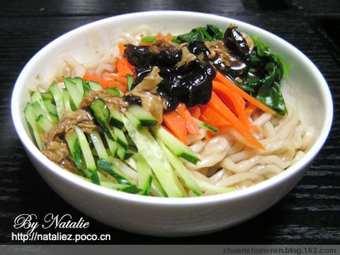 5、将面盛入碗中,放上各种细丝,淋上酱汁,放上一点辣椒酱,搅拌均匀即可。