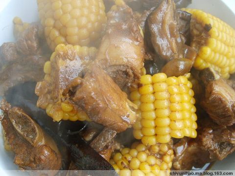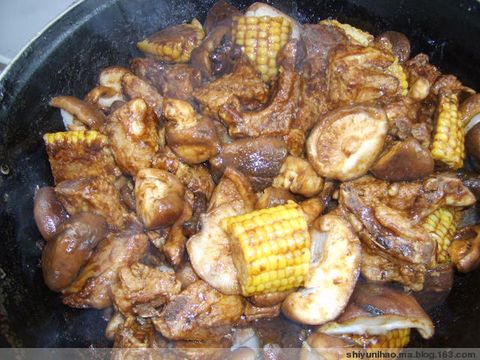 做法:锅置于灶上,开火,倒入适量色拉油,放姜、葱、大蒜、花椒、八角、草寇、桂皮、香叶、白芷、肉桂等材料炸一下,再倒入泡好的排骨煸炒;等排骨水分全部出来时加料酒,然后再放适量(可微多些,因为我没再放酱油)甜面酱翻炒片刻,最后加入玉米段和香菇,倒稍多些的开水,加盖,大火烧开,转慢火大约炖40分钟(中间适当加点盐),汤至粘稠即可。