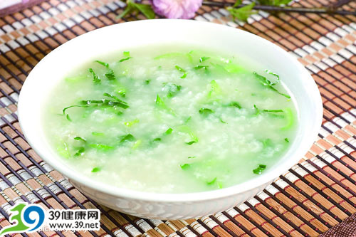 ①将青菜(菠菜、油(油食品)菜、小白菜的叶)洗净,放入开水锅内煮软,切碎备用。②将大米洗净,用水泡1~2小时,放入锅内煮30~40分钟,在停火之前加入精盐及切碎的青菜,再煮10分钟即可。