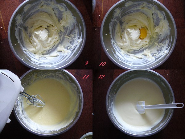 12.把酸奶油加入奶酪中,继续搅拌(这一步可以用刮板,以免产生过多的气泡)
