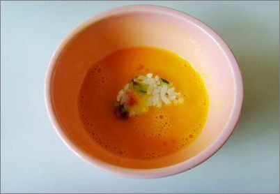 4、 成型的米饭坯放入打散的蛋液里,使其均匀的包裹一层蛋液。