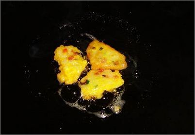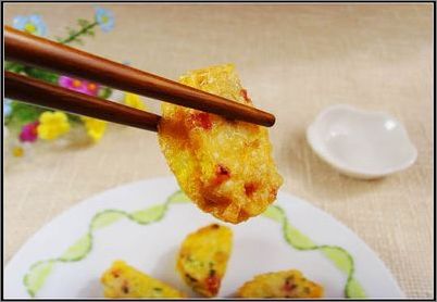 5、锅入油至6成热加沾裹好蛋液的米饭坯,而后转文火煎制,至外表酥脆即可装盘,可蘸适量番茄酱食用。