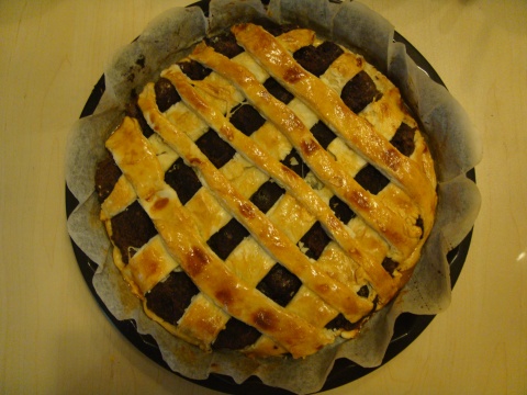 4)另一份油水面和油酥面,同样叠起,擀平,再叠,再擀,做成薄饼。切成条,交叉盖在豆沙层上;