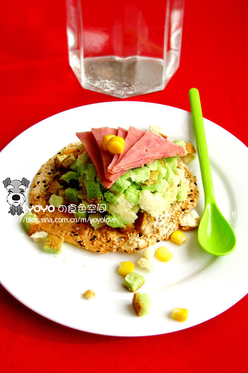 两片吐司切1厘米见方的丁 ;橙子对半切,握住一半挤出汁来,淋在吐司上,装杯进微波炉高火2分钟 ;吐丝倒在薄饼上,再搭配些火腿就可以吃咯~