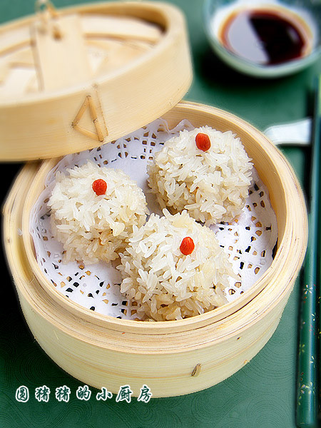 5.内烧开水,放上蒸架,上架蒸10分钟即可 (蒸好的丸子要乘热吃,不然糯米发硬了口感不好.吃的时侯可以用一些生抽做蘸料)