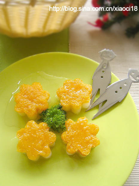 做法: 1.红薯洗净,表面用到切2刀十字形的刀痕,山药洗净,刨皮, 入蒸锅蒸熟 2).红薯捣成泥,山药切成约一厘米厚的大片 3).取一个自己喜欢的模具(我用的是做饼干的花型模具),泡在水里(为了方便脱膜 4).把模具放在山药片上使劲压下去,再把旁边其余部分去掉,用调羹把红薯泥填在里面,最后锅内烧少许热水,放入白糖化开,放入水淀粉收汁,淋在糕上即可!(也可不用白糖汁,直接淋蜂蜜也可) 备注: 1).山药和红薯用蒸的方法比较干爽,容易做造型 2). 模具用水打湿,调羹到最后上面铺平的时候也用水打湿比较好操作