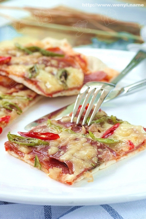 做法:1)将酵母倒入温水中搅拌均匀,5分钟后,将酵母水倒入面粉中揉合成团。加入盐和橄榄油,继续揉成光滑的面团 2)盖上一层保鲜膜,饧发1小时,至面团蓬发。将发好的面团中的空气揉出去,再盖上保鲜膜,二次饧发半小时。拿出后,揉出面团中的空气 3)将案板上撒些干面粉。将面团用手压扁,擀成2毫米的薄片。放入烤盘中,刷一层意大利肉酱料。 4)将1/3马苏里拉奶酪均匀的撒在面饼上,再铺上咸火腿片,再撒上剩余的2/3马苏里拉奶酪,最后把切好的青红椒丁撒上。 5)烤箱预热后,用200摄氏度的温度,烘烤15分钟即可