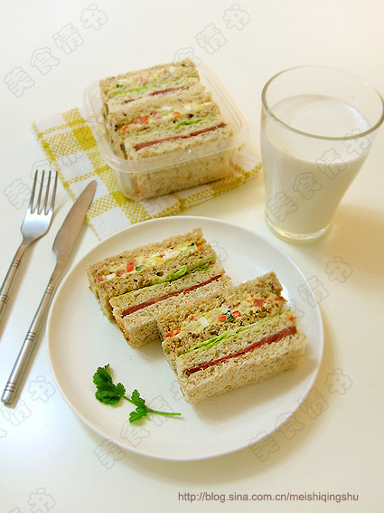 材料:面包片,鸡蛋,火腿,胡萝卜,黄瓜,土豆,鸡脯肉,生菜,牛肉片