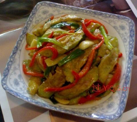 4、锅内放底油,烧热后放葱、蒜、椒丝、再放炸好的茄条,速倒入对好的汁,颠翻