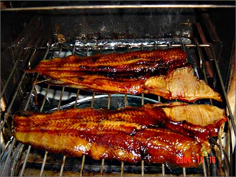 两边不时取出涂上腌汁和糖胶,重复两次,烤至两边干身颜色棕红便可