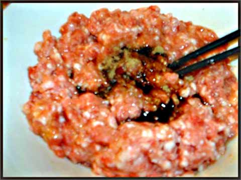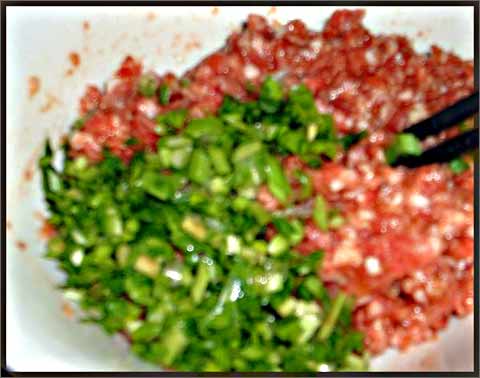 在搅好的肉馅上面铺切好的韭菜。注意哦!吃多少放多少韭菜,否则韭菜馅很难闻,剩下全部浪费了!