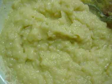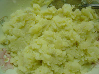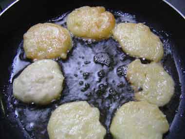 5.将加过面粉(定形)后成的土豆饼雏形放进平底锅里炸,记得用小火来做,否则会影响土豆饼的色泽。