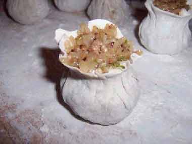 6.接下来就该面团出场了。把揉好的面稍整理,擀成荷叶状的圆片,包入炒好的馅料,捏捏压压,如此这般之后就成了下面的样子了。
