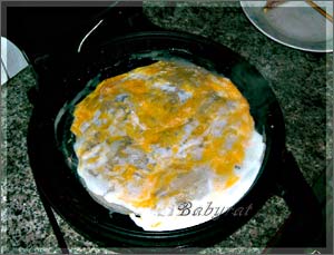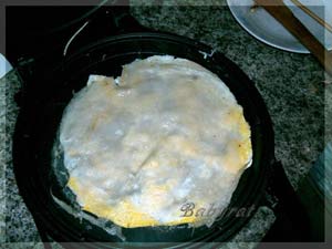 待底下的面糊形成薄饼后,把整个面饼翻过来,鸡蛋那面向下。