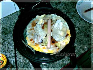 现在在面饼上抹上爱吃的酱,我抹的是韩国豆酱和中式辣酱。然后,我又铺上生菜叶,还加了一根火腿肠。