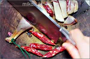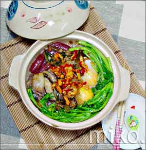 这个时候,饭就半生熟啦,可以把腊味放进去一齐煲