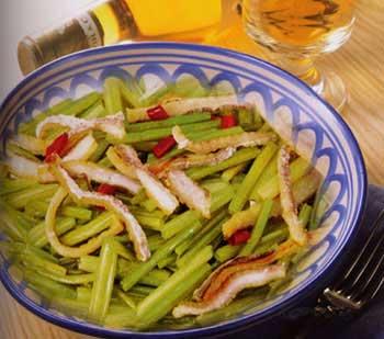 1.选鲜嫩芹菜,摘去叶、根洗净,用刀把梗部顺直剖开,投入开水锅中,见水再开时捞出,沥水后切成一寸长的段,加入精盐、味精放盘内。