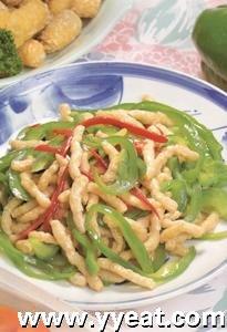 17、青椒拌干丝 原料: 青椒五两 香腐干三块 香油一钱 白糖一钱精盐一钱 味精十粒