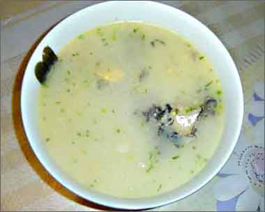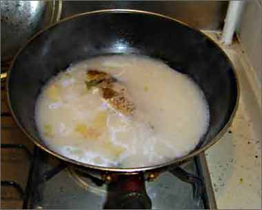 5、盖锅盖,大火煮沸后改中火炖20分钟。汤就成白的了。如果你有足够的时间,就放2碗水,大火煮沸后改小火炖2小时,那时侯鱼肉都溶到汤里了,更美!