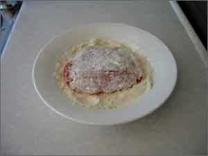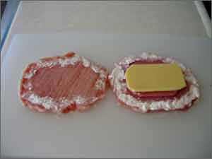 再把两片肉合起来,并且用点力把外围一圈压紧压密,否则炸的时候容易散开,内馅起司就会漏出来了.把肉沾上一层面粉,要沾的均匀唷,沾好拿起时稍微轻拍肉身,把多余的面粉拍掉