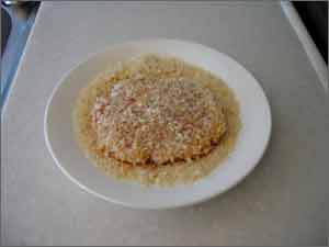 沾了面粉的肉再沾上一层蛋液 最后再沾一层面包渣,沾面包渣时可以用点力压一下,让面包渣粘的更扎实正反面重复多压几次,直到看不到肉身为止,沾好拿起时稍微轻拍肉身,把多余的面包渣拍掉