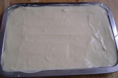 10、将搅好的面糊倒进铺好油纸的烤盘,抹平,进烤箱倒数二层,用烤网架着
