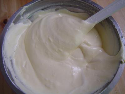 9、.先将1/3蛋白与蛋黄糊轻拌匀,再将1/3蛋白与蛋黄糊轻拌匀