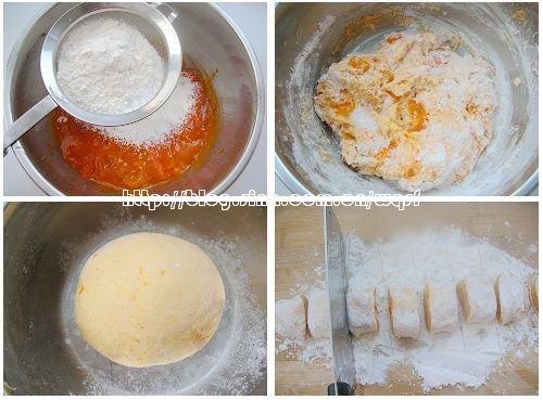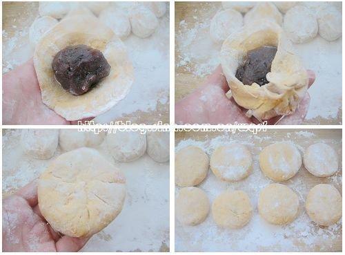 4、用擀面杖将面团擀成厚皮,取适量豆沙馅放入其中,像包包子一样将口收紧,压扁即可。