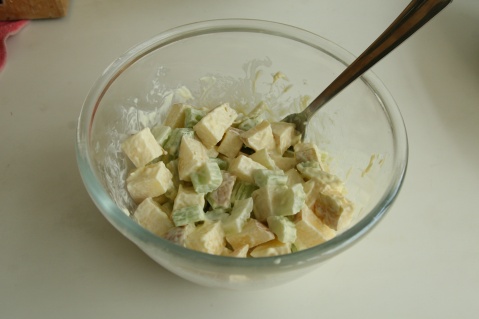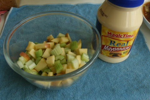 制作:把苹果洗净,去核,切成方丁,芹菜切的和苹果丁一样大。放3勺沙拉酱,一拌,