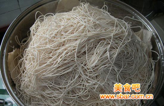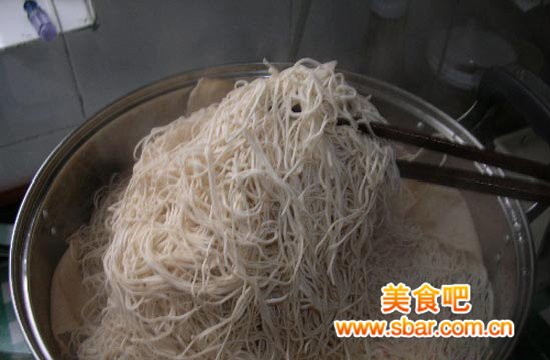 把蒸好的面条放到无水的盆里,把粘连的面条挑开。