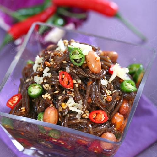 4)将凉透的蕨根粉捞出,沥干水分,放入调料碗中拌匀,最后加上蒜末、青红椒、炸花生米,淋入红油即可。